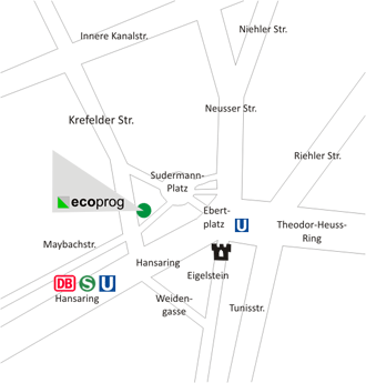 By plane you arrive at the "Cologne Bonn Airport". From its station you can take the train S13 directly to station "Hansaring". The ride takes about 20 minutes.